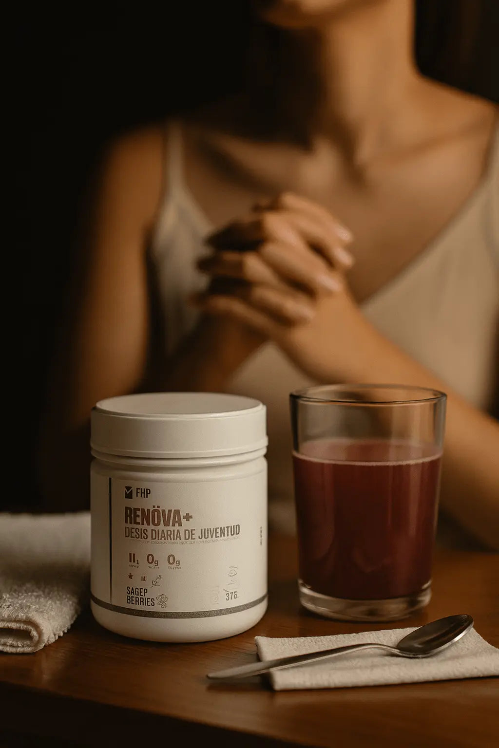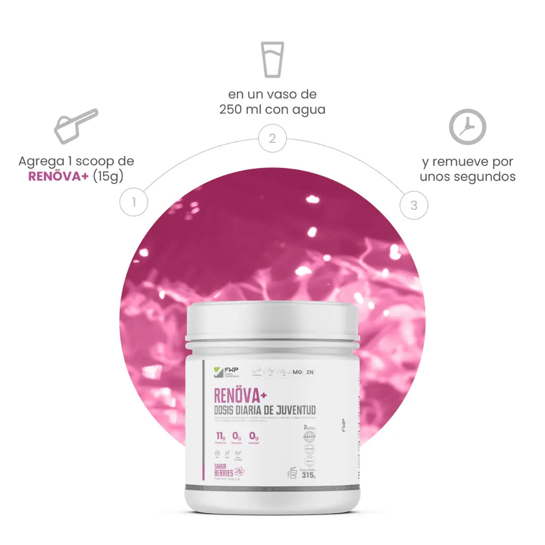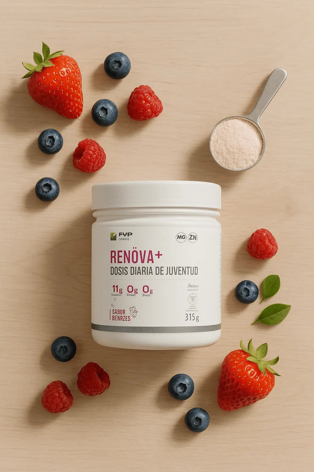 RENÖVA+ aporta colágeno hidrolizado con biopéptidos activos y Resveratrol, un potente antioxidante que ayuda a combatir el estrés oxidativo.